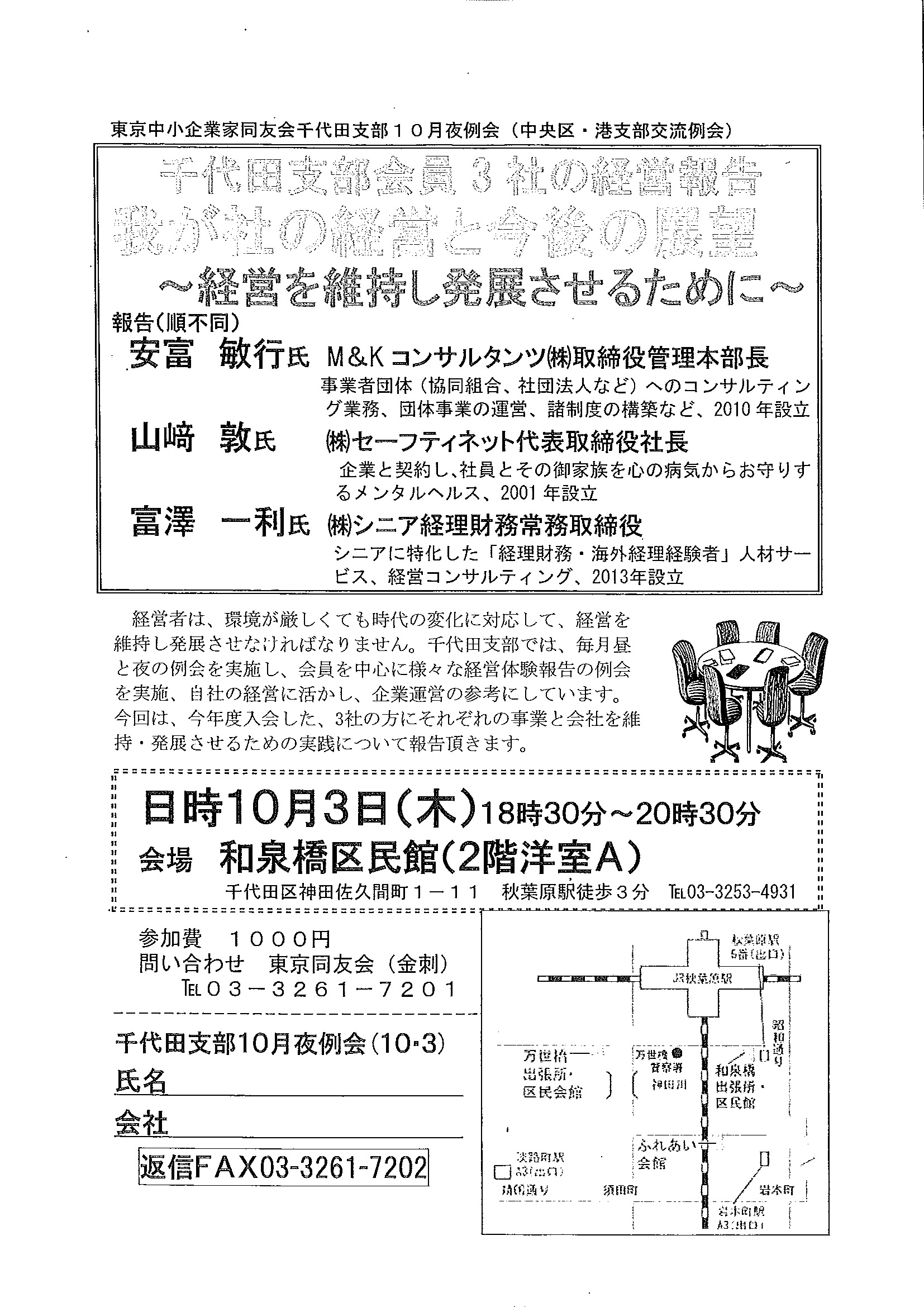 「10/3日に昼夜に渡ってシニア経理財務をPRします」 2013年9月26日2017年7月21日 ブログ 「10/3日に昼夜に渡ってシニア経理財務をPRします」 ・昼12:00~同友会中央区支部情報交換会に参加して3分間スピーチをやります。 ・夜18:30~同友会千代田支部で「我が社の経営と今後の展望」というテーマで 30分間のスピーチをやります。 ◎1社でも多く、シニア経理財務を知って頂く為のPRです。