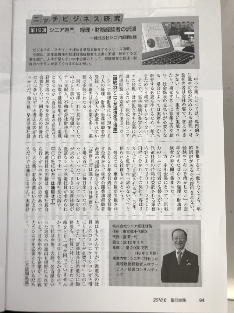 銀行実務(銀行研修社発行)6月号のニッチビジネス研究【シニア専門 経理・財務経験者の派遣】に取り上げられました。 2018年5月31日2018年10月5日 取材実績 銀行実務(銀行研修社発行)6月号のニッチビジネス研究【シニア専門 経理・財務経験者の派遣】に取り上げられました。